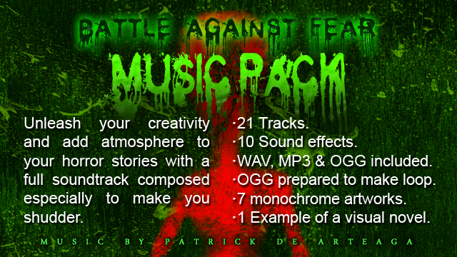 Battle Against Fear Music Pack, soundtracks composed by Patrick de Arteaga, it has all for your horror story. There is a wide range of terrifying melodies, from a mystery music box to the most strident orchestra. There are also royalty free music tracks with progressive changes and their split versions are included so you can choose freely. All this is accompanied by a main melody that is repeated in several tracks in different ways to make your story leaves a trace on the hearts of your viewers. All this creepy music works as a full soundtrack!